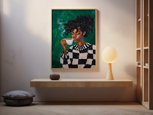 Black Woman Coffee Wall Art Print – Bold Afrocentric Painting for Kitchen or Living Room Décor
